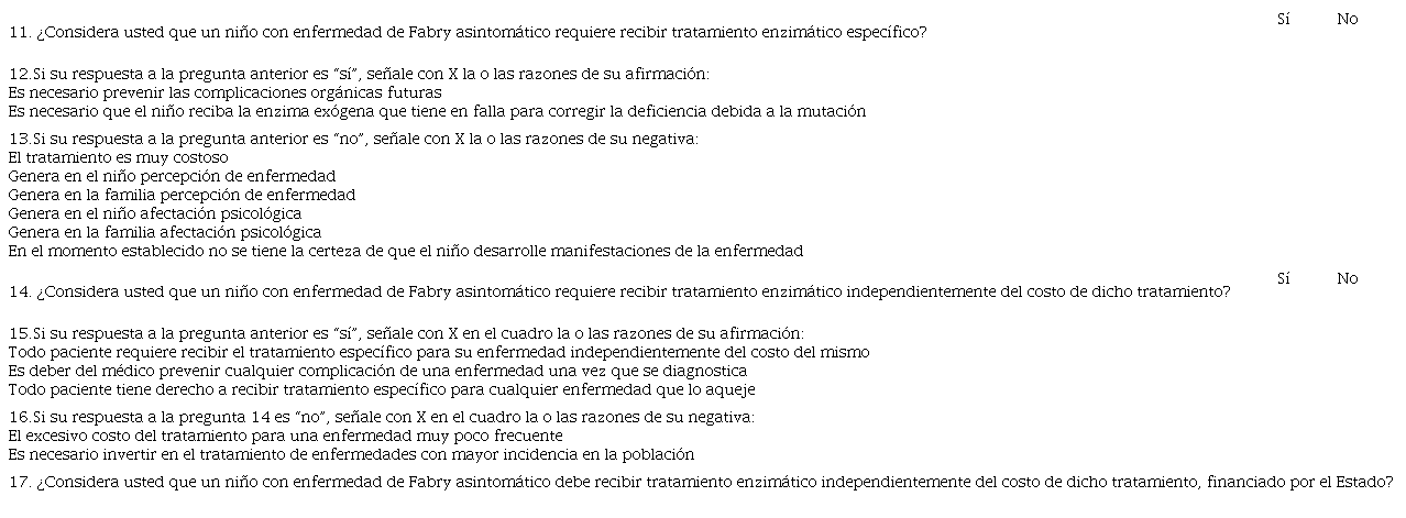 La pregunta 17, “¿un niño con enfermedad de Fabry asintomático debe recibir tratamiento enzimático independientemente del costo de dicho tratamiento, financiado por el Estado?”, la respondió de forma afirmativa el 83,33 % de los médicos encuestados.