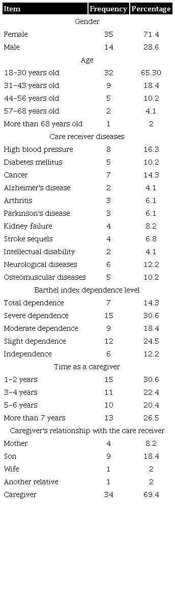 Firstly, we studied sociodemographic variables. There were 35 female (71.4 %) and 14 male (28.6 %) caregivers of working age; 69.4 % were formal caregivers (healthcare professionals) and 30.6% informal caregivers (family). This distribution corresponds to a visible phenomenon in the Colombian context that explains reduced birth rates, smaller households, and family verticalization that have decreased the number of formal caregivers in some socioeconomic levels 26.