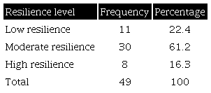 Results: 35 women and 14 men participated in this study. The formal (69.4 %) and informal caregivers, mostly family (30.6 %), were between 18 and 30 years old (65.30 %). Their resilience levels were high (16.3 %), moderate (61.3 %), and low (22.4 %). There was a significant association between caregiver type and resilience level (p < 0.05). Other studied covariates did not show a significant association.