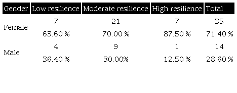 An attempt was made to identify a relationship between gender and resilience levels, finding that 70 % of women have a moderate resilience level, while in men, it reaches 30 %. These data coincide with studies aimed at evaluating resilience by gender. It is striking that the study by González, Arratia, and Valdés 27 found that women require external support to be resilient (Table 3).
