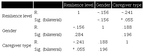 The relationship between caregiver type (formal and informal) and the caregiver resilience level had a significance level of p < .05. In other words, a relationship is established between caregiver type and resilience level, considering that, in this study, 69.4% were formal caregivers (professional) of working age that have been serving as such for 1-2 years (Table 4).