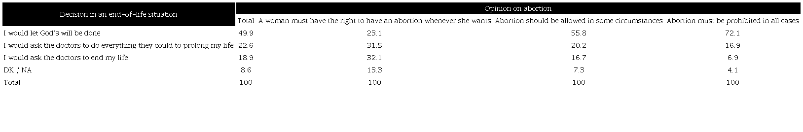 Respondents' decisions in the case of an irreversible disease are different depending on their position about issues that have stirred public debate and in which religious institutions have played a prominent role. Those who defend a woman's right to terminate her pregnancy also claim their autonomy to decide on the end of their lives. On the contrary, most of those who oppose abortion in any situation are willing to accept God's will at the end of their lives. These associations, though meaningful, are not to be interpreted too simplistically. Indeed, among those who consider that a woman must have the right of abortion, 23.1% would let God's will be done if faced with a terminal health problem (Table 10).