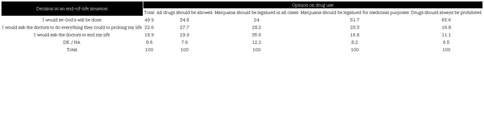 Besides, the value assigned to individual decisions in other issues, mainly abortion and, to a lesser extent, drug use, coincides with a greater predisposition towards autonomy to make decisions at the end of life. Unlike those works which show that in the context of a terminal illness it is the most religious individuals that show a greater predisposition to request life-support treatments to prolong their lives, even if aggressive 20, here we see that the majority of the answers indicates that, in the case of a terminal and irreversible illness, people would expect “God's will to be done.”