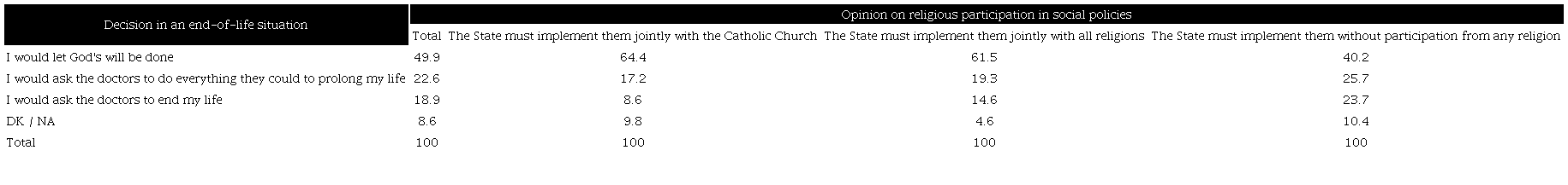 Personal positions in an end-of-life situation are also associated with the different representations that citizens have about the regulatory framework that must ideally govern the relationship between the state and religious institutions. However, some observations are necessary. In Table 12, it should be noted that the most significant percentage of respondents who support the participation of religious groups in public policies are also the majority of those who accord a decisive role to God at the end of their lives. In this case, there is no clear association between those who advocate greater laicization of the state and reject religious presence in state-run schools and those who demand autonomy in deciding about a terminal illness situation in their lives.