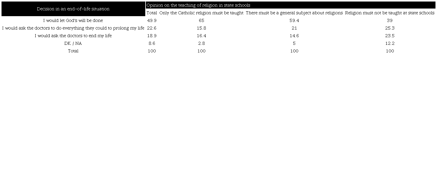 In this regard, respondents who approve of religious teaching in general, and Catholic in particular, in state schools are also willing to accept God's will if faced with a terminal disease. Those who support keeping education non-confessional do not evidence a well-defined profile concerning the decision at the end of their lives (Table 13).