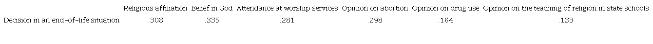 Multiple correspondence analysis confirms the association between the religious variables (religious affiliation, belief in God, and attendance at worship services) and the decision in an end-of-life situation. Believing in God, attending worship services weekly, and identifying as an Evangelical define a social segment that leans towards leaving the end of one's life in the hands of God (Table 14).