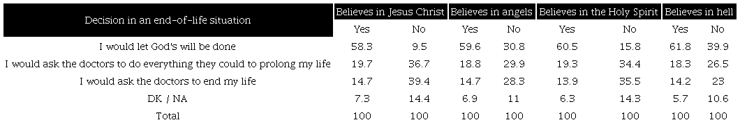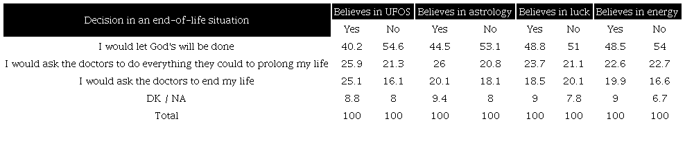 An association exists between the belief in the icons most identified with institutionalized religion (Jesus Christ, angels, the Holy Spirit, hell) and the disposition to accept God's will in case of a terminal illness. To a greater extent, those who have beliefs that are more distant from religious apparatuses (UFOS, astrology, luck, energy) adopt a relatively autonomous position towards the end of their lives (Tables 8a and 8b).