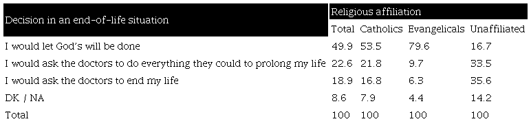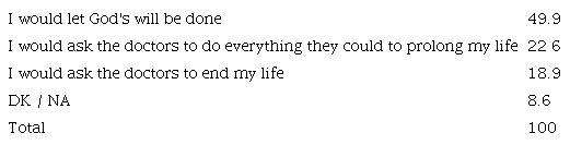 Half of the population living in Argentina answered that, faced with terminal illness, they would let God's will be done. The rest of the respondents are divided between those who would ask doctors to do what they could to prolong their lives (22.6%) and those who would ask them to bring their lives to an end (18.9%) (Table 2).