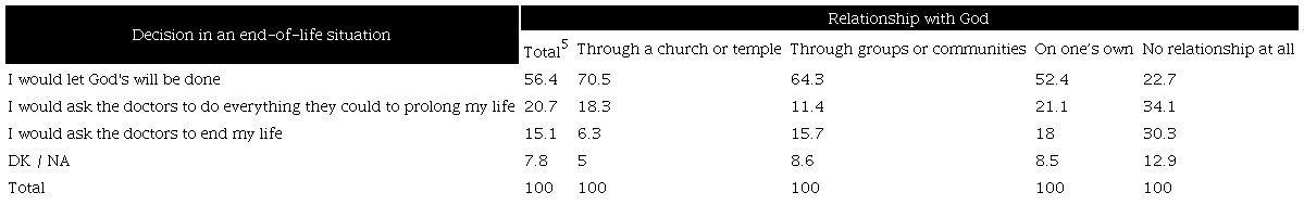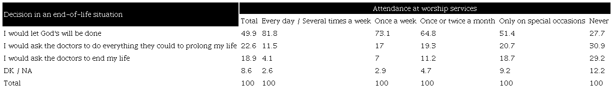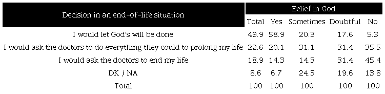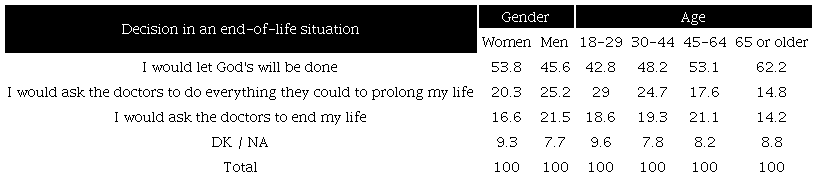 According to the belief in God, the analysis of attitudes towards the end of life confirms that the religious factor is a conditioning variable. A proportion of 45.4% of those who do not believe in God would ask doctors to end their lives. If we add those who would opt for asking health professionals to prolong their lives (35.5%), 80.9% of non-believers defend their autonomy in making decisions about the end of life. Only 5.3% of that segment would accept God's will. In contrast, among believers, 58.9% give God the power to determine the end of their lives, whereas 14.3% would choose euthanasia (Table 6).