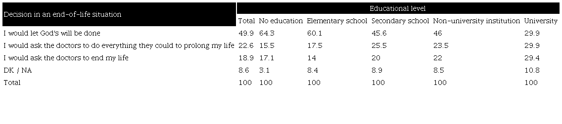 The distribution of personal decisions in an end-of-life situation is different according to the population's educational level. Among those with a lower educational level, accepting God's will reaches a percentage as high as 60%. Regarding both prolonging and putting an end to life, individual decisions are more frequent among those with a higher educational level. In any case, it is interesting to note that the answers of respondents with a university education are divided into three thirds as to the decision they would make in a terminal illness situation (Table 4).