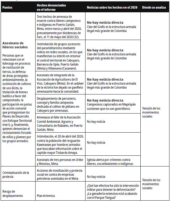 En consecuencia, el informe expone siete antecedentes: 1) tres amenazas de muerte contra líderes campesinos e indígenas en Puerto Gaitán, Meta, entre marzo y abril del 2020; 2) actuar intimidante de grupos sucesores del paramilitarismo mediante videos en redes sociales, en los que manifiestan su interés en retomar el control territorial en Cabuyaro, Barranca de Upía, Puerto Gaitán y Villanueva, Casanare; 3) asesinato de integrante de la Asociación de Agricultores de El Viso, en Cabuyaro, Meta. Sobre el cadáver de la víctima fue dejado un panfleto amenazante contra la comunidad; 4) desplazamiento de personero, concejal y familia campesina dedicada al cultivo de plátano en Cabuyaro, por amenazas; 5) amenazas contra líder de Asociación Comité Ambiental, Agrario y Comunitario de Rubiales, en Puerto Gaitán; 6) intimidación, el 20 de abril del 2020, contra la población del resguardo Kawinanae, por hombres armados que buscaban información sobre el capitán mayor Tiobardo Amaya; y 7) asesinato de tres personas en Uribe y Mesetas, Meta, presuntamente por disidencias de las Farc, el 11 de mayo del 2020.