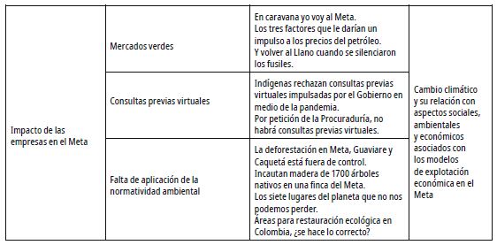 Los resultados parten del informe del 14 de mayo del 2020, hecho por las organizaciones sociales y de derechos humanos pertenecientes a la Red Llano y Selva durante la pandemia del COVID-19 44, y de la manera como se fomenta el pensamiento crítico o se perturba la visión cotidiana de las problemáticas de sustentabilidad ambiental y cambio climático con noticias o con la omisión de las mismas por parte de los periódicos tradicionales, durante el año 2020. De esta manera, se analizan artículos de El Tiempo y El Espectador publicados durante el tiempo de la pandemia y relacionados con las exigencias del informe de adoptar medidas eficaces que garanticen los derechos humanos integrales, territoriales y ambientales en la región, frente a cuatro puntos: 1) asesinato de líderes sociales, 2) criminalización de la protesta, 3) riesgo de desplazamiento, y 4) impacto de las empresas en el Meta.