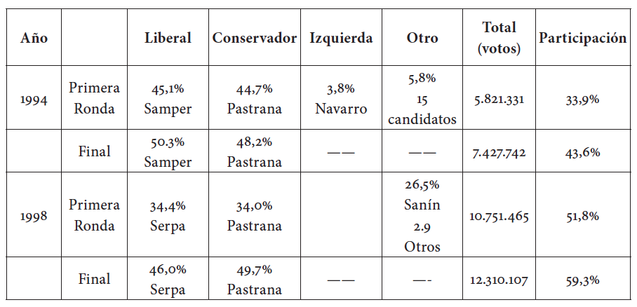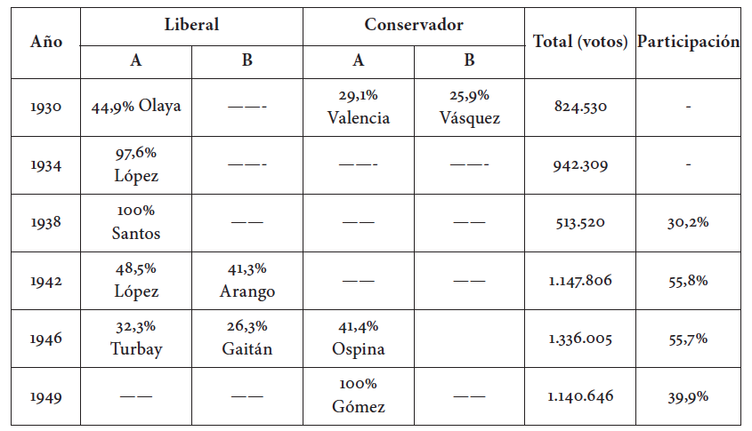 El monopolio electoral de los dos partidos tradicionales durante casi todo el siglo xx en Colombia se aprecia en las figuras 1 a 4, que revelan los resultados electorales presidenciales entre 1930 y 1998.