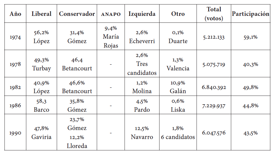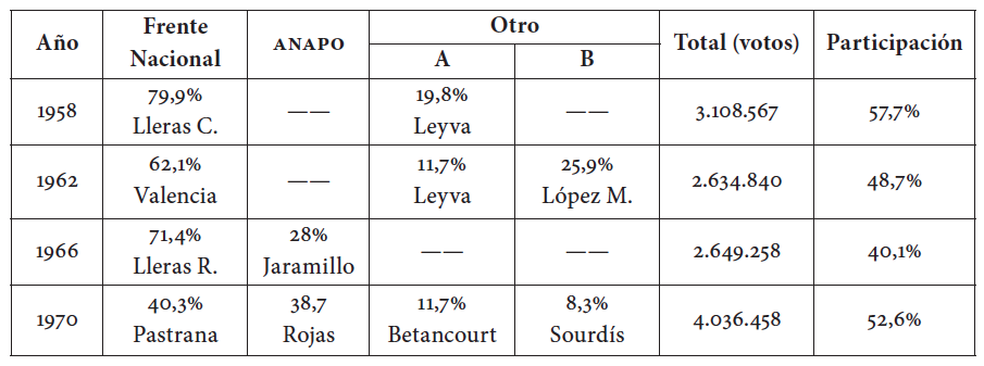 Durante los primeros años de La Violencia el ala más reaccionaria del Partido Conservador reprimía a sangre y fuego no solo a los liberales en armas y sus supuestos simpatizantes en la población civil, sino que también, envalentonado por el anticomunismo de los primeros años de la Guerra Fría, el Gobierno quiso eliminar a los pequeños grupos de autodefensa en el campo dirigidos por comunistas (entre ellos los que después en los años sesenta se organizarán como las farc). Esta política anticomunista también animó a los Gobiernos del Frente Nacional. El pacto prohibió participar en las elecciones a partidos distintos de los tradicionales, incluyendo el Partido Comunista, y sus primeros Gobiernos, obrando bajo tutela militar norteamericana, siguieron atacando a los pequeños grupos rurales comunistas y a los otros grupos guerrilleros marxistas que proliferaron en el país durante la década de los sesenta. La exclusión de terceros partidos durante el Frente Nacional sembró la idea entre la izquierda colombiana de que siempre había sido excluida y reprimida. Pero antes de La Violencia, aunque no tuvieron mucho éxito, los partidos de izquierda pudieron participar electoralmente sin restricciones. El Frente Nacional había sido aprobado por una amplia mayoría de votos en un plebiscito en 1957 y, al principio de sus dieciséis años de existencia (1958-1974), a pesar del monopolio de los dos partidos tradicionales, la participación en las elecciones fue relativamente alta. La insatisfacción con el Frente Nacional creció con el tiempo, sin embargo, y muchos votantes potenciales registraron su desilusión absteniéndose de votar. La desilusión creció después de 1970, cuando muchos alegaban que el fraude había derrotado al candidato para la presidencia de la anapo, desencanto que engendró al grupo guerrillero m-19, lo que complicó aún más el panorama político violento del país. La izquierda electoral no logró beneficiarse con estas actitudes cuando el Frente Nacional terminó en 1974, como revelan los datos electorales detallados en los cuadros presentados al principio de este ensayo.