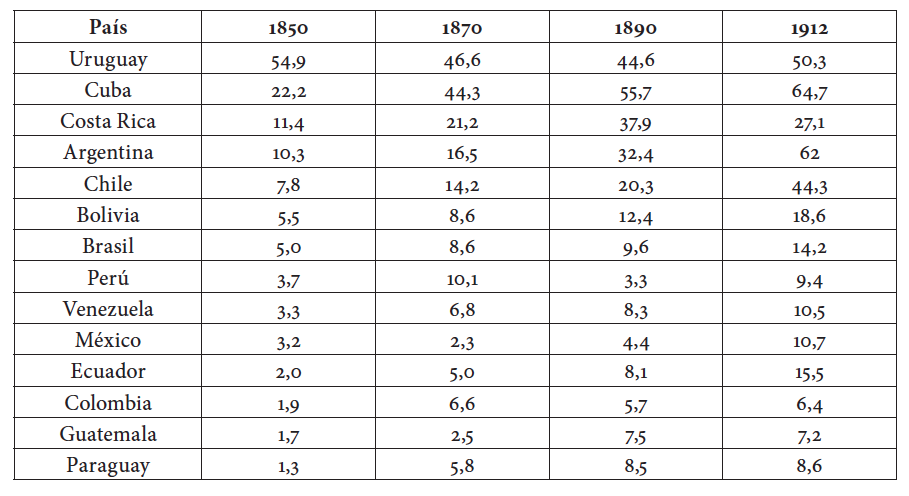 Comparado con los otros países latinoamericanos, la capacidad exportadora de la economía colombiana no se desarrolló en forma robusta y duradera durante todo el siglo xix. Esto se ilustra en la figura 5, que se basa en el trabajo del historiador económico inglés Victor Bulmer-Thomas. La figura compara el valor de las exportaciones por cabeza de varios países latinoamericanos durante este periodo.7 Incluso después del advenimiento de la economía cafetera, Colombia tenía en 1912 el índice más bajo de todos los países comparados.