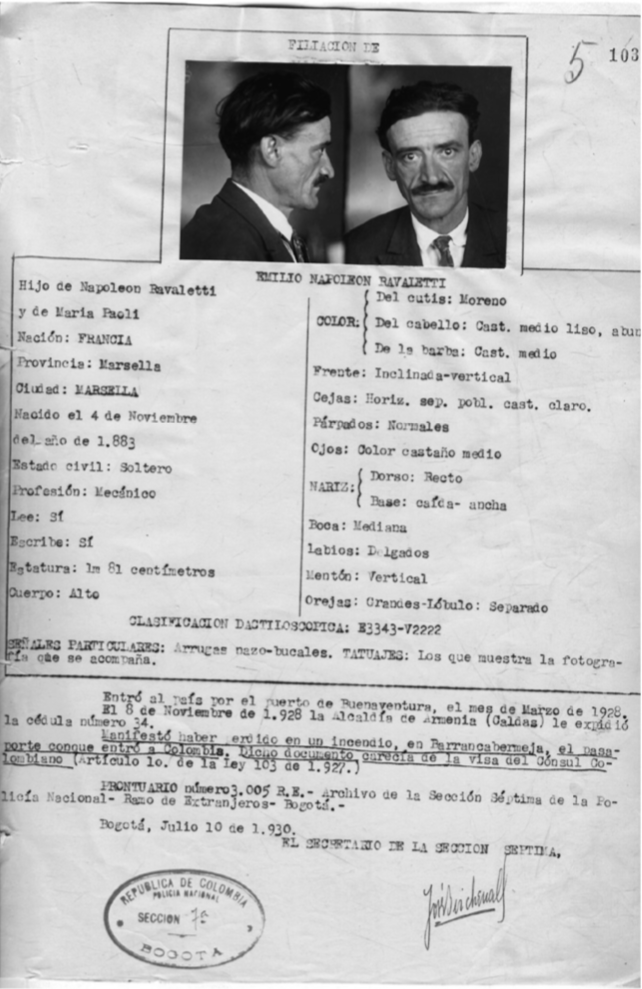 Durante el interrogatorio se le había preguntado a Ravalletty si poseía un pasaporte y una cédula. Ante las autoridades debía aclarar cuál había sido la instancia de expedición del pasaporte y, en caso dado, si había presentado los documentos en la sección 7ª de la Policía. Su respuesta fue positiva. El pasaporte había sido expedido por la prefectura de Marsella y había sido “cambiado en Buenaventura por el cónsul francés”, con fecha 9 de noviembre de 1929. En efecto, el pasaporte (pero renovado) lo había presentado en el momento de la indagatoria, junto con su cédula refrendada por la Dirección General de la Policía y con el sello del Departamento de Identificación Criminal de Medellín. Lo dicho queda incluso registrado durante la indagatoria cuando el escribano anotaba entre paréntesis: “presentó el pasaporte a que se refiere […] presentó la cédula que menciona”.72 La Policía complementaba la información anotada en la ficha antropométrica, según la cual la alcaldía de Armenia (Caldas) le había expedido un año antes la cédula número 34, el 8 de noviembre de 1928, dado que había perdido su pasaporte en un incendio en Barrancabermeja. Sin embargo, “dicho documento carecía de la visa del Cónsul Colombiano”.73