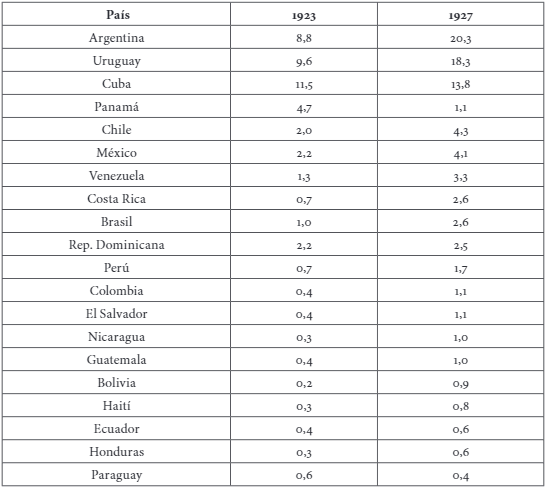 La segunda década del siglo veinte es crucial para la infraestructura de América Latina. Por un lado, fue el comienzo de la importación de automóviles, lo que aumentó significativamente el parque automotor. El caso de Colombia es interesante porque, aunque el número per cápita siguió siendo bajo en relación con otros países de la región, tuvo el mayor crecimiento de Suramérica en el periodo 1923-1927 (ver tabla 1).18 El proceso de modernización liberal que recorre la mayor parte de los países de América Latina, como proyecto político-cultural, busca en la infraestructura vial el eje del desarrollo territorial, que es el paradigma en el que se sustenta el modelo de nación. Colombia no es una excepción, aunque el modelo liberal este modelo haya sido impulsado por un gobierno conservador y luego acelerado por la República Liberal (1930-1946).