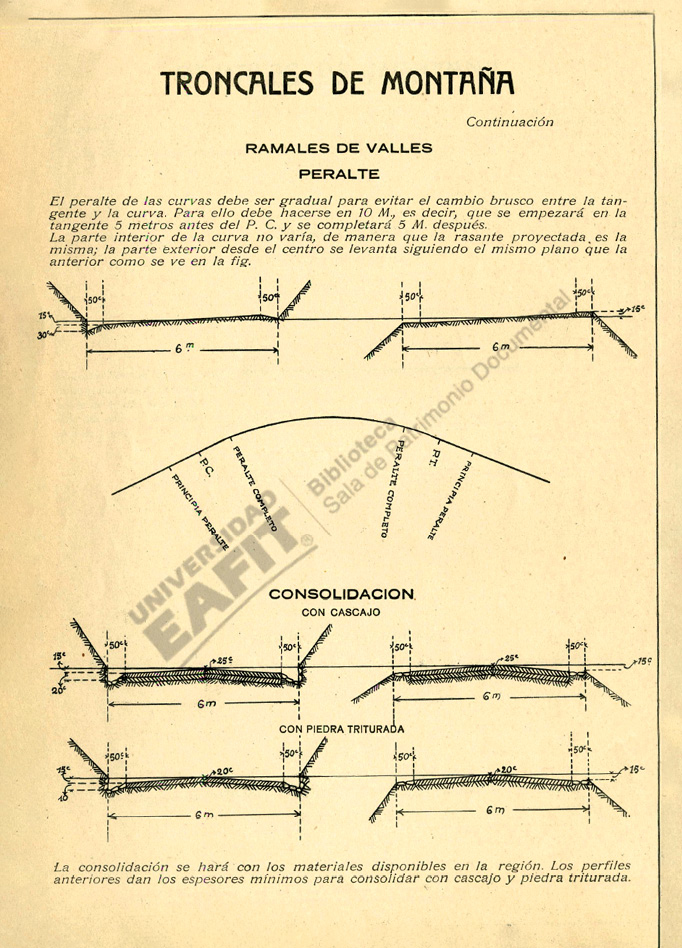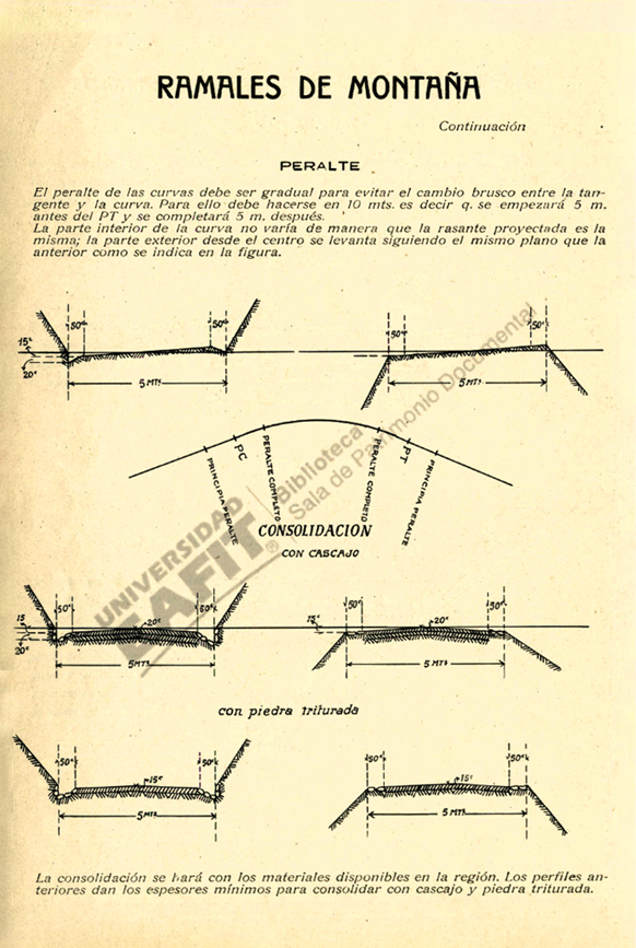 La entidad presentó un informe a la Asamblea con una propuesta detallada de reorganización del ramo de caminos, así como de los estándares técnicos que debían seguir las vías: carreteras troncales en los valles, carreteras troncales de montaña, ramales en los valles, ramales de montaña, caminos con trazado de carretera, caminos de herradura y caminos de penetración. Se diferenciaban en los valores de los parámetros que caracterizan a una vía y que definirían las velocidades máximas, la sostenibilidad y los costos debidos al movimiento de tierra: pendientes, radio de curvas, tangentes y plataforma mínima. Adicionalmente, estaban las “obras de arte” y, de crucial importancia para los costos de materiales y mantenimiento, los de “consolidación”, es decir, los materiales de los soportes, los drenajes, las bases y las superficies, con sus respectivos espesores (figura 1). Todos ellos se calculaban asumiendo un flujo y una carga máxima de modo que el desgaste fuera mínimo. Un piso de concreto sería más caro que en cascajo, pero más estable y con costos de mantenimiento menores.