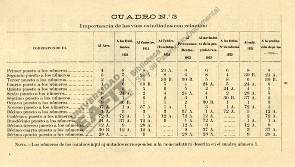 La Junta Técnica nombrada en 1926 fue un esfuerzo para que el ejecutivo departamental pudiera ejercer mayor control sobre la planeación de construcción de carreteras y caminos. La red debía servir a la integración del departamento, es decir, a su conexión intermunicipal. El gobierno departamental necesitaba una política de vías, es decir, unos criterios de priorización para la construcción y reparación de vías (como lo requería Bogotá respecto a los departamentos). Para esto, la Junta produjo un cuadro (figura 3) que presentaba el resultado de la aplicación de un estándar discreto de rango.57 El cuadro establecía la importancia de las vías estudiadas con relación a: área, habitantes, catastro, tráfico, rentas, movimiento de propiedad raíz, producción y mercados agropecuarios.