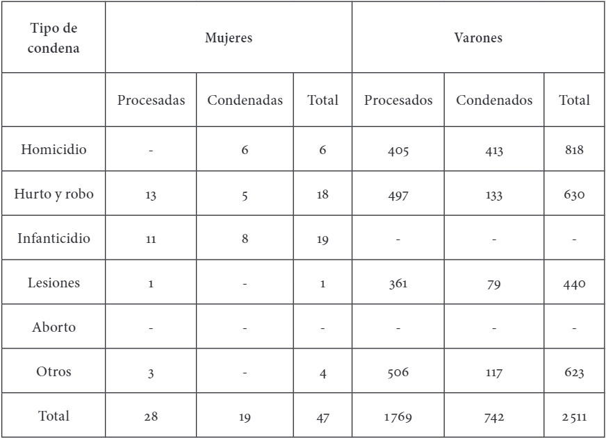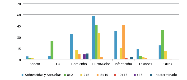 Al analizar los tipos de delito y las penas establecidas encontramos que, a pesar de que hubo un pequeño grupo fluctuante (10 % del total) que circuló por la penitenciaría bajo la modalidad de arresto (prostitutas principalmente), el resto de las mujeres permaneció al menos seis meses en la institución. Aquí se abrió una brecha entre un 50 % que permaneció allí hasta que fueron sobreseídas o absueltas y un 40 % que tuvo una condena firme de parte de la justicia que osciló entre uno y seis años de penitenciaría hasta la condena por tiempo indeterminado. El gran porcentaje de mujeres absueltas y sobreseídas, principalmente por falta de pruebas, nos hace suponer que si bien el Estado tuvo la intención de criminalizar esos delitos, las garantías procesales se transformaron en un obstáculo para poder castigarlas efectivamente.
