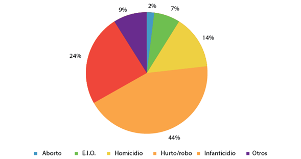 Las mujeres en la Provincia fueron aprehendidas por diversos tipos de delito, principalmente atentados contra la propiedad privada y las personas. Entre ellos se destacaron el hurto, el infanticidio y el homicidio. Consideramos que esto no fue casual pues no todas las conductas consideradas como transgresiones por la ley son efectivamente castigadas, sino que esto responde a un proceso de selectividad del tipo de infracción cometida. Allí recae el poder punitivo como resultado de un complejo proceso social y de agencias de control. La población existente en prisión tampoco es un buen indicador de la función punitiva del Estado ni de la criminalidad real en una sociedad. Este dato representa una mínima parte de los delitos que son castigados y solo nos permite conocer los crímenes que son seleccionados para ese tipo de castigo.8 En ese sentido, los números arrojados por nuestro corpus documental no pueden ser comprendidos solo como delitos cometidos y tomarse, por sí mismos, como representativos de la criminalidad real de la sociedad.