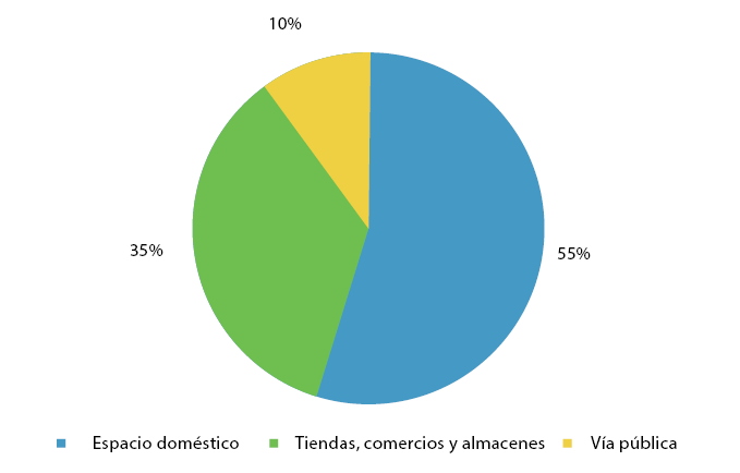 Dicho esto, consideramos que durante el periodo de consolidación del Estado se dio un proceso de reestructuración de los dispositivos formales para reprimir la violencia que se volcaron principalmente hacia dos formas delictivas: hurtos y robos, por un lado, y asesinatos, por otro. Sin embargo, esa transformación tuvo una impronta de género que se verifica en las formas en las que estos delitos se llevaron a cabo. Por ejemplo, en los delitos de asesinato, cuando las imputadas eran mujeres, la víctima solía ser un recién nacido. Es decir, fueron principalmente infanticidios. Si tenemos en cuenta, como afirmó Jacqueline Vassallo,25 que las mujeres fueron escasamente condenadas por infanticidio durante el periodo colonial, los resultados de nuestra sistematización estarían esclareciendo sobre un alza en el número de delitos de infanticidio descubiertos entre fines del siglo xix y principios del xx. Los infanticidios poseen algunos puntos en común con los delitos de robo que aportan a pensar la selectividad penal femenina. Como señaló Howard Becker, el proceso de construcción social del delincuente va más allá de lo establecido por la ley.26 Ladronas e infanticidas poseyeron un perfil social en común: eran en su mayoría jóvenes, empleadas domésticas, provenientes de los sectores populares de la población y migrantes.27 Asimismo, muchas de ellas fueron descubiertas y aprehendidas dentro del espacio doméstico (ver figura 4). El empleo dentro de un hogar en relación de dependencia pareció haber dejado a estas mujeres expuestas a las miradas de un “otro”, como sus patrones, que ejerció poder sobre ellas.