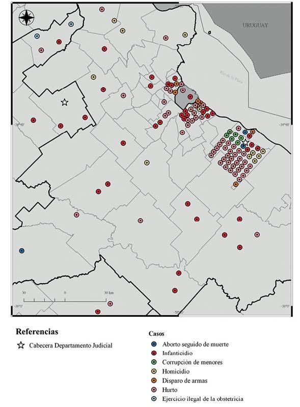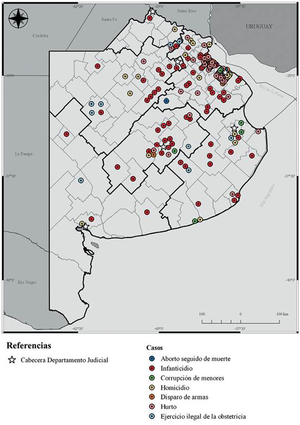 A diferencia de las zonas urbanas en las que se concentraba la mayor cantidad de población, la producción fabril y comercial y la administración de justicia, en el resto de la Provincia se puede observar no solo que la cantidad de mujeres detenidas fue menor, sino que prevalecieron los casos de infanticidio y homicidio que se producían en zonas rurales. Como ya hemos estudiado en otras ocasiones, esta diferencia de los tipos de delitos entre las zonas urbanas y rurales se explica a través del desarrollo del capitalismo y su impacto en las ciudades. Sin embargo, es insoslayable destacar la dinámica propia de los pequeños pueblos del interior, donde los rumores y las habladurías de los vecinos recayeron duramente sobre las mujeres y su comportamiento sexual, al punto de direccionar las investigaciones policiales en los casos de aborto, infanticidio y ejercicio ilegal de la obstetricia.30