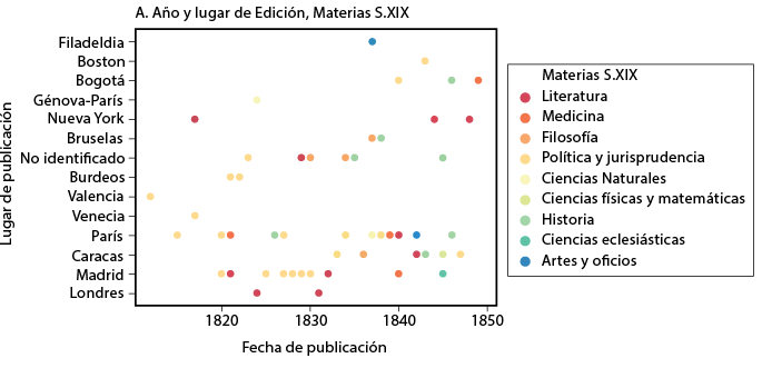 Las ediciones revelan obras de reciente impresión. Con fechas extremas entre 1812 y 1848, el 60 % de los títulos se imprimió en las dos décadas inmediatamente anteriores a la transferencia.20 Al mirar el conjunto (figura 4), es notable la primacía del libro europeo,21 sin embargo, las obras impresas en Caracas son más numerosas que las de Bogotá, Nueva York y otras ciudades europeas. Es probable que la colección se haya formado durante la vida de Ancízar, en el curso de sus funciones públicas y privadas antes de llegar a la Nueva Granada, con una participación marginal de obras heredadas por la tradición familiar, si las hubo.