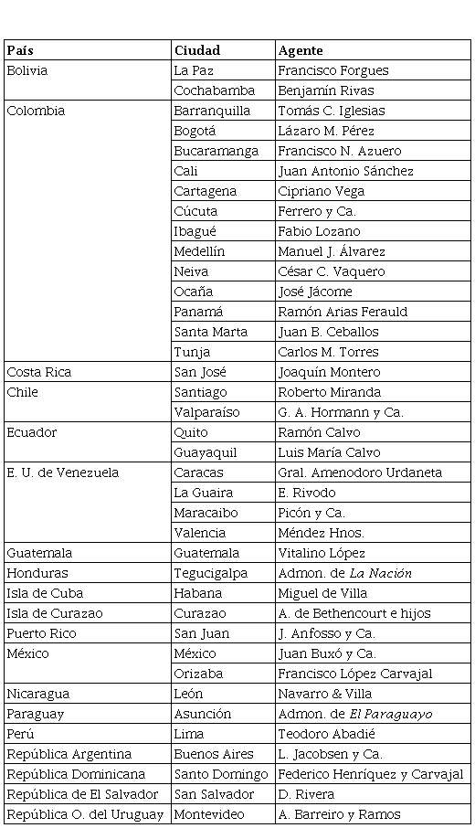 Méjico, 6 volúmenes; Isla de Cuba, 8 volúmenes; Guatemala, 2 volúmenes; Puerto Rico, 3 volúmenes; Honduras, 2 volúmenes; Salvador, 2 volúmenes; Nicaragua, 1 volumen; República Dominicana, 3 volúmenes; Costarrica [sic], 2 volúmenes; Venezuela, 6 volúmenes; Colombia, 6 volúmenes; Ecuador, 4 volúmenes; Perú, 4 volúmenes; Bolivia, 3 volúmenes; Paraguay, 1 volumen; República Argentina, 6 volúmenes; Chile, 6 volúmenes; Uruguay, 5 volúmenes.