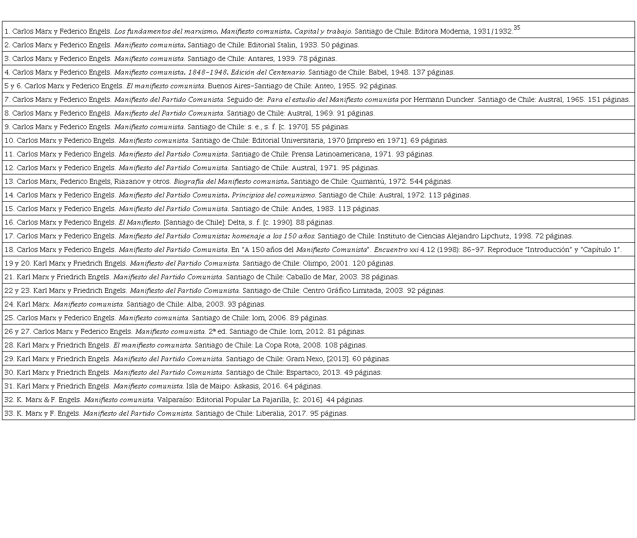 En total, entre 1933 y el 2020 se llevaron a cabo en Chile 33 ediciones del Manifiesto comunista (tabla 1), un número exiguo si lo comparamos con las 202 ediciones brasileñas, las 113 mexicanas y las 101 argentinas.57 Pero también comprensible si se consideran los sucesivos periodos de represión sufridos por las izquierdas chilenas (1927-1931, 1948-1958, 1973-1990).