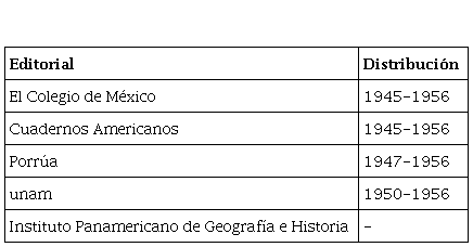 A lo largo del periodo estudiado, fueron cinco las editoriales mexicanas que el Fondo distribuyó en Argentina. En la siguiente tabla se detallan tanto la editorial como el periodo durante el cual fue distribuida.