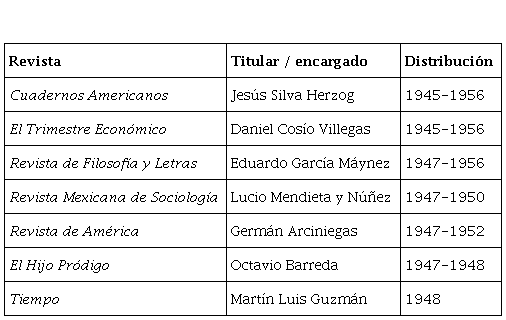 Por otro lado, los convenios comerciales con revistas mexicanas generalmente involucraron a personas que estaban vinculadas de una u otra forma al Fondo como miembros de la junta de gobierno o autores publicados por la editorial. Esto propiciaba cierta cercanía y compromiso por parte de los directivos del sello mexicano para aceptar la firma del convenio y que la publicación fuera distribuida por la sucursal argentina. El funcionamiento de estos acuerdos representaba una triple tarea para la sucursal, pues esta se encargaba de la circulación, comercialización y transferencia de las ganancias a México. Como es posible observar en la siguiente tabla, fueron siete las revistas que se comercializaron durante los años estudiados: