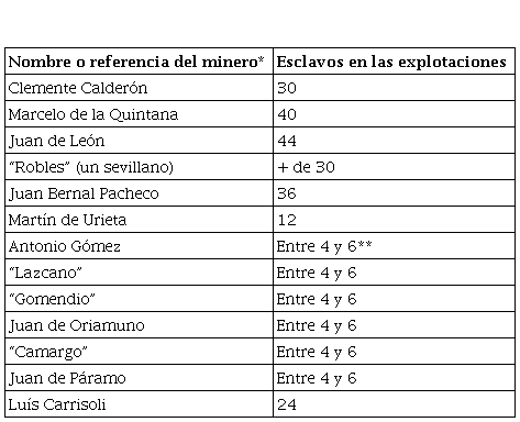 En 1691, con el cambio de gobierno, se dio una nueva recaudación del quinto real. Ese año, Carrisoli remitió 2175 castellanos de oro en polvo, que correspondían al periodo comprendido entre 1686 —año de la última recaudación— y 1691.77 Para esta fecha, también encontramos un memorial que recoge el nombre de los mineros y el número de esclavos que sacaban oro en el Darién (tabla 1).