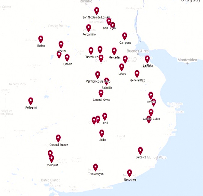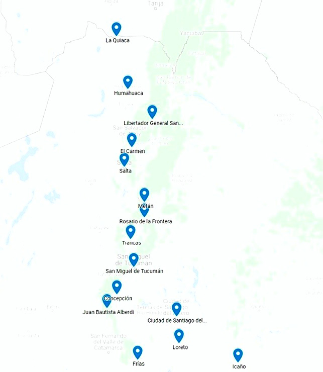 Casi de forma simultánea a la aprobación de ese marco regulatorio, en 1921 Borton emprendió un extenso viaje que lo llevó a recorrer buena parte de la provincia de Buenos Aires y algunas localidades de Santiago del Estero, Tucumán, Salta y Jujuy. En territorio bonaerense, visitó la ciudad de La Plata en febrero y al menos treinta y cinco pueblos entre el 10 de abril y el 14 de agosto. A finales de septiembre se encontraba en las provincias del norte, allí visitó trece pueblos y tres capitales: San Miguel de Tucumán, Salta y Santiago. El 16 de diciembre firmó el último informe desde la localidad santiagueña de Icaño. El resultado, miles de kilómetros recorridos y cientos de personas entrevistadas para componer un extraordinario relevamiento de información sobre bibliotecas. Las figuras 1 y 2 que se muestran a continuación indican los puntos en los que Borton estuvo o dijo haber estado.