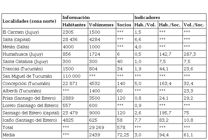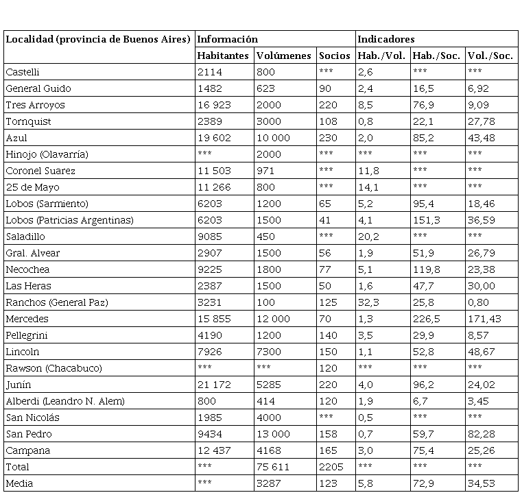 Para ampliar el panorama estadístico precedente, las tablas que siguen muestran la información relativa al número de volúmenes y de asociados de cada biblioteca visitada por Borton, al tiempo que se relacionan estos datos con el de población.29 Tres indicadores resultan de este cruce: los dos primeros muestran cuántos habitantes había en la localidad de referencia por cada volumen y socio; el tercero marca la cantidad de libros por cada asociado.