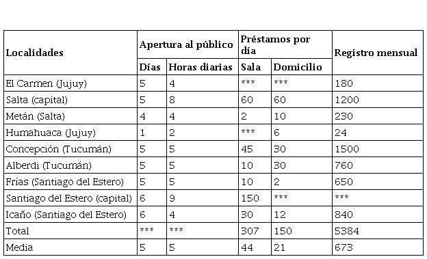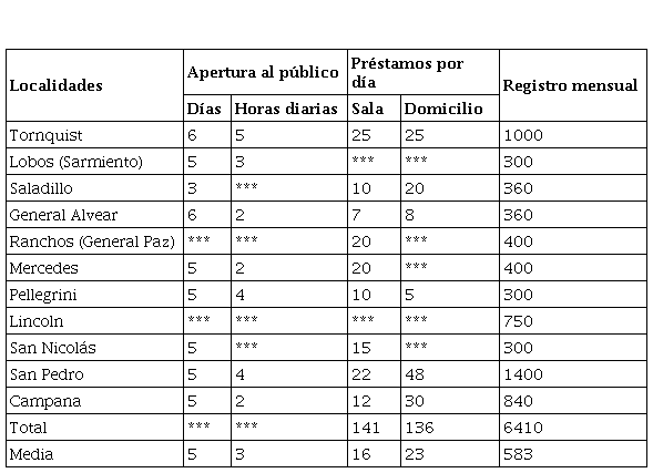 La circulación de las obras fue otro dato al que Borton prestó atención. Con rigurosidad el inspector apuntó los días y horarios de apertura: usualmente de lunes a viernes por la tarde y por las noches, entre tres y cinco horas cada día. En lo que respecta al servicio de préstamo, gran parte de las bibliotecas no dispusieron de una estadística sólida. Cuando aparece alguna referencia, hay disparidad en la toma del registro. Así, por ejemplo, no siempre se observa la distinción entre la asistencia a la sala de lectura y el préstamo a domicilio. Las cifras suministradas expresan, en unos casos, el volumen de consultas mensuales y, en otros, el flujo diario. Incluso, en algunas planillas se provee un resumen semestral. En síntesis, la estandarización era insipiente. Cuando Borton encontró lo que buscaba, dejó frases como “su estadística de lectores es prolija e interesante”. Con todo, y al considerar al menos la presencia de un dato relativo a estos puntos y estimar, cuando fue posible, los faltantes sobre la base de la cantidad de días de apertura del local, el resultado fue el que se muestra en la tabla 3.