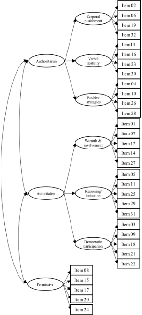 Pedro et al. (2015), aimed to formally adapt a self-report portuguese version –QDEP– as well as to further investigate portuguese mothers and fathers parenting styles. Using a 2081 participants’ sample (1085 mothers and 996 fathers), the authors analyzed a four models’ set: (1) a 2nd order tri-factorial model, consistent with the original conceptualized model; (2) a 1st order tri-factorial model (i.e., only with the three main parenting styles); (3) two-factors model (i.e., positive and negative parenting); and (4) a unidimensional model. The results showed that the original 2nd order tri-factorial structure, composed by authoritative, authoritarian and permissive styles, clearly was identified in the portuguese sample, revealing to be more proper than a 1st order, bi-factorial or unidimensional model. However, the modification fit indexes suggested that some items were loading in different dimensions from the original (cross-loadings), as well as the existence of correlations between residuals. Therefore, they proposed a reviewed model, in which items 23 and 30, initially in verbal hostility sub-dimension, were placed in Authoritarian style, and item 24, originally belonging to permissive style, was positioned in Connection of Authoritative style. These changes are theoretically supported, and more congruent to the portuguese culture (Pedro et al., 2015).
