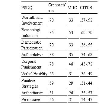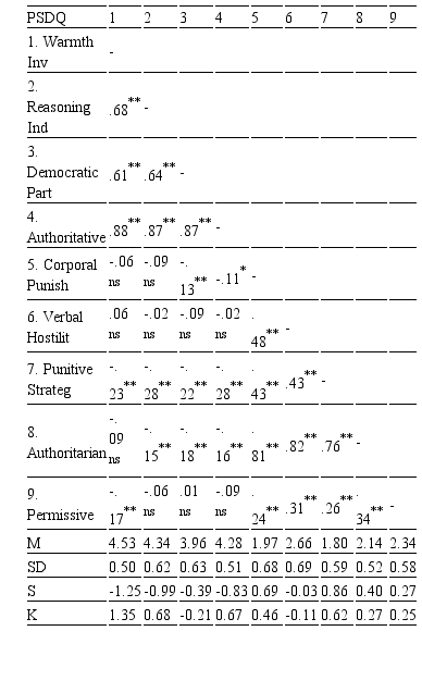 The correlations between PSDQ dimensions and other variables revealed that parents generally used less warmth, are less involved, and recur less to corporal punishment strategies as children grow.
