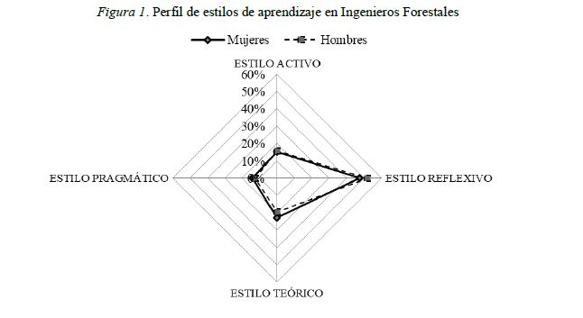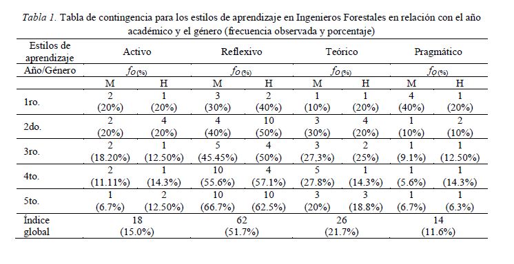 Los porcentajes de mayor representatividad se corresponden con el estilo de aprendizaje reflexivo, con un 51.7% de índice global, seguido de los estilos teórico (21.7%), activo (15.0%) y pragmático (11.6%). Cuatro de las diez mujeres (40%) que cursan el primer año de la carrera Ingeniería Forestal prefieren el aprendizaje basado en la contrastación de ideas y procedimientos desde un pensamiento orientado al sentido práctico, solucionar problemas con rapidez.