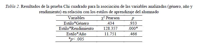 En la tabla 2 se observa una asociación significativa entre las variables estilo de aprendizaje y rendimiento (p< .005). Por el contrario, no se halla una asociación significativa (p> .005) entre las otras dos relaciones estudiadas, es decir, el estilo de aprendizaje y género, por un lado, y el estilo de aprendizaje y el curso.
