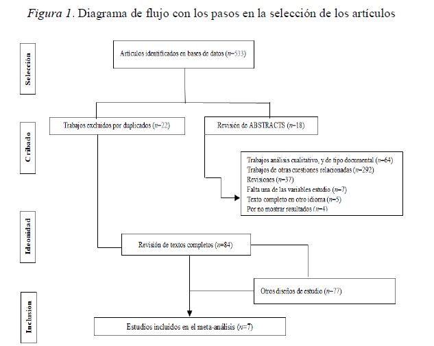 La figura 1 muestra el proceso de selección de estudios (diagrama de flujo). Un total de 533 trabajos fueron identificados. Veintidós trabajos duplicados fueron eliminados. Se revisaron un total de 427 estudios, de los cuales, por diversos concentos, quedaron 88 para revisión. Posteriormente, fueron eliminados 77 trabajos por utilizar otro tipo de diseño, en la mayoría de los casos, transversal. Finalmente, un total de siete trabajos se incluyeron en la revisión sistemática y metaanálisis.