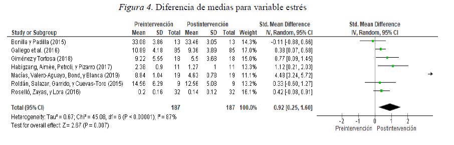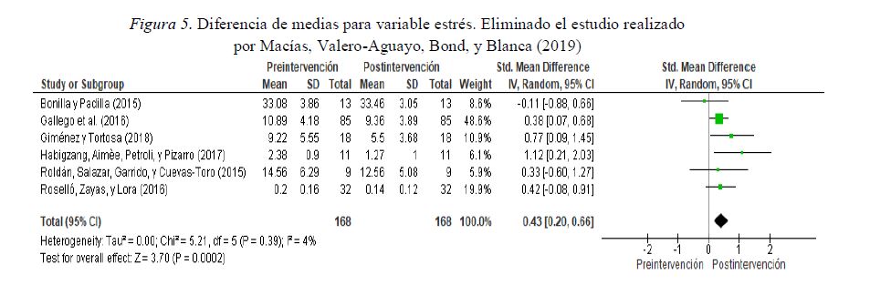 Siete fueron los estudios seleccionados, con un total de 187 participantes, donde utilizaron el estrés como una variable de intervención (ver Figura 4). En seis estudios se observó un efecto positivo tras la intervención, lo que indica una clara mejoría. Sólo en uno de ellos no se encontraron cambios. El estandarizado la diferencia de media fue de 0.92 (0.25, 1.60). La prueba de tamaño del efecto total fue significativa (Z=2.67; p<0.007). Respecto a la heterogeneidad entre los diferentes trabajos, el I² mostró una heterogeneidad alta (I²=87%), por lo que debemos ser cautelosos al interpretar este resultado, ya que indica que hay diferencias entre los estudios. Esto puede deberse a la intervención utilizada. Si eliminamos el estudio de Macías, Valero- Aguayo, Bond, y Blanca (2019), como vemos en la figura 5, el estandarizado la diferencia de media fue de 0.43 (0.20, 0.66). La prueba de tamaño del efecto total fue significativa (Z=3.70; p<0.0002). Respecto a la heterogeneidad entre los diferentes trabajos, el I² mostró una heterogeneidad baja (I²=4%), bastante mejor que en la situación anterior.