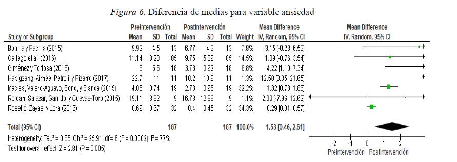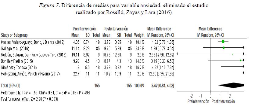 Al igual que la variable estrés, siete fueron los estudios seleccionados para la variable ansiedad, con un total de 187 participantes, donde utilizaron la ansiedad como una variable de intervención (ver Figura 6). El estandarizado la diferencia de media fue de 1.53 (0.46, 2.61). La prueba de tamaño del efecto total fue significativa (Z=2.81; p<0.005). Respecto a la heterogeneidad entre los diferentes trabajos, el I² mostró una heterogeneidad alta (I²=77%), que el igual que la variable estrés, debemos ser cautelosos al interpretar el resultado. Si eliminamos el estudio de Roselló, Zayas y Lara (2016), como vemos en la figura 7, el estandarizado la diferencia de media fue de 2.42 (0.81, 4.02). La prueba de tamaño del efecto total fue significativa (Z=2.96; p<0.003). Respecto a la heterogeneidad entre los diferentes trabajos, el I² mostró una heterogeneidad alta (I²=49%), bastante mejor que en la situación anterior, aunque continúa con una heterogeneidad moderada.