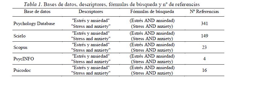 Se realizó una búsqueda exhaustiva en bases de datos internacionales, siguiendo las recomendaciones PRISMA propuestas por Moher et al. (2009), para así establecer conclusiones (Antman, Lau, Kupelnick, Mosteller, y Chalmers, 1992). Las bases de datos consultadas fueron Psychology Database, Psicodoc, Scielo, Scopus y PsycINFO. Respecto a los filtros de búsqueda en las distintas bases de datos, se aplicó: artículos de revista, período de publicación artículos, con acceso a texto completo, entre otros. Además, se utilizaron otros filtros más específicos en las bases de datos Psicodoc y PsycINFO, concretamente: Metodología (diseño longitudinal). Para las estrategias de búsqueda se aplicó el operador booleano AND, para las siguientes fórmulas de búsqueda: (“Estrés”) AND (“Ansiedad”) y (“Stress”) AND (“Anxiety”), obteniendo tras dicha búsqueda un total de 533 trabajos para revisión y lectura. El período de búsqueda incluyó aquellos trabajos publicados en el último quinquenio, es decir, entre el año 2014 y el 2019. La revisión de artículos se realizó durante los meses de agosto y septiembre de 2019, donde se procedió a analizar los textos que tratan la relación entre estrés y ansiedad.