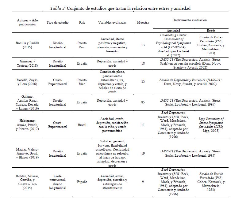 Respecto a las intervenciones, tuvieron características diferentes, tanto en las técnicas o programas de intervención, como en lo que respecta a la duración de las sesiones y la duración de la práctica diaria. Se utilizaron, en dos de ellos, prácticas de meditación de conciencia plena (mindfulness), concretamente, en los estudios realizados por Gallego et al. (2016) y por Roselló, Zayas, y Lora (2016). Por su parte, Bonilla y Padilla (2015), además de utilizar dicha práctica de meditación, añaden el programa de intervención MBSR, que consiste en una intervención grupal para eliminar síntomas de estrés y ansiedad. En otro sentido, Giménez y Tortosa (2018) llevaron a cabo un programa para la mejora de la condición física (resistencia aeróbica y fuerza-resistencia), con objeto de eliminar los síntomas de ansiedad y estrés en personal dependiente de Sustancias Psicoactivas (SPA). Otros estudios, como el realizado por Habigzang, Aimèe, Petroli, y Pizarro (2017) utilizan una terapia cognitivo-conductual para mujeres víctimas de violencia de género. Por su parte, Macías, Valero-Aguayo, Bond, y Blanca (2019) llevan a cabo la psicoterapia analítica-funcional para mejorar la salud mental en el trabajo y, Roldán, Salazar, Garrido, y Cuevas-Toro (2015) aplicaron un programa de intervención grupal para la disminución de problemas psicológicos de familiares que conviven con pacientes con TMG.