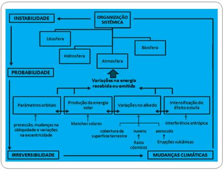 O sistema climático também está sujeito à influência da atividade solar, da atmosfera, dos oceanos, do gelo, das florestas, das superfícies e das atividades humanas. Desse modo, o fenômeno das mudanças climáticas pode ser compreendido levando-se em conta a dinamicidade, a instabilidade e o caráter probabilístico a ele associados.