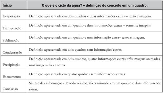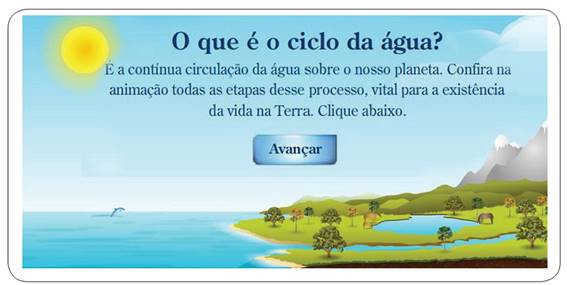 O infográfico animado4 possui 13 quadros interativos que explicam as etapas do processo do ciclo da água no planeta. Informações extras estão dispostas em 12 quadros, nos botões SAIBA MAIS ou emlinks destacados em azul no texto. Durante todos os quadros, os textos e as imagens estão permeados de informações e detalhes a serem explorados por professores e alunos. O usuário tem a opção de avançar ou retornar informações das etapas, clicando nos botões indicados abaixo do texto. Pode ainda clicar nos oito botões que estão localizados na parte superior do infográfico animado para visualizar imagem e texto das etapas do ciclo da água. As definições dos processos do ciclo da água são apresentadas no infográfico em textos, imagens e gráficos.