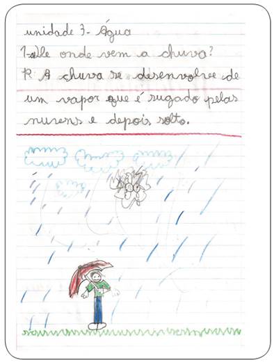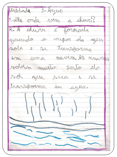 O primeiro momento em que os desenhos foram produzidos ocorreu ao final da primeira aula. Nessa aula, a professora realizou um levantamento das ideias preliminares dos alunos solicitando que eles levantassem palavras relacionadas ao novo tema de estudo de ciências - a água. Ao fim dessa atividade inicial e exploratória, e em função de questões levantadas pelas crianças, a professora pediu a elas que respondessem, no caderno, por meio da produção de um desenho acompanhado por uma explicação, à pergunta "De onde vem a chuva?". Na segunda aula, a professora retomou parte das palavras evocadas pelos alunos para introduzir conceitos sobre os estados físicos da água, organizou com os alunos uma legenda e utilizou tirinhas de histórias como suporte para que os alunos produzissem textos, a partir dos conceitos e ideias discutidos na aula. Na terceira aula da sequência, a professora projetou no quadro à frente da turma um infográfico animado sobre as várias etapas do ciclo hidrológico na natureza. Cada etapa do infográfico animado foi explorada e discutida com as crianças, com tempo para que se manifestassem e apresentassem suas interpretações sobre o que estava acontecendo. Após a apresentação de todo o infográfico animado, a professora decidiu reiniciá-lo, permitindo uma participação ainda mais intensa das crianças. No início da quarta aula da sequência, a professora distribuiu duas folhas com o título "Ciclo da água", solicitando aos alunos que produzissem um desenho e um texto sobre as informações apresentadas no infográfico animado da semana anterior.