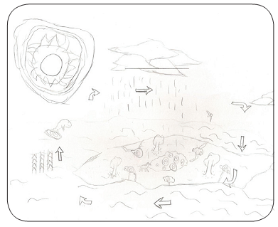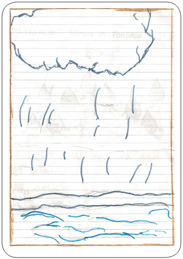 Em seu primeiro desenho, Lucas utilizou um espaço, logo abaixo de seu texto, para desenhar uma porção de riscos no formato de ondas na horizontal, representando a água na parte inferior da folha de seu caderno, e riscos na vertical representando o vapor. Devido à limitação espacial para desenhar a nuvem, ocupada pelo texto, o aluno resolveu reproduzir o desenho na folha seguinte de seu caderno. Em sua explicação sobre a chuva, o aluno descreveu sua ideia sobre a evaporação, sem utilizar essa palavra, tanto em seu texto quanto em seu desenho. Para o aluno, nesse momento, o vapor de água se transformou na nuvem e o sol, único elemento que apareceu no texto e não foi representado no desenho, foi o responsável por secar a nuvem para ocorrer a chuva.
