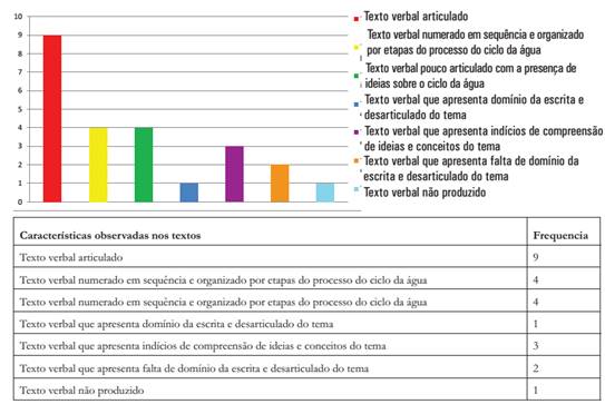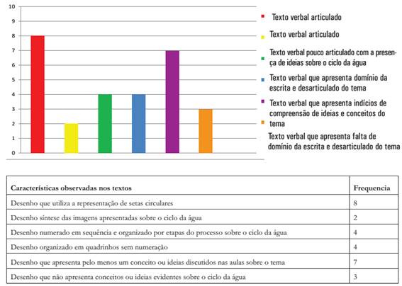 os textos e os desenhos apresentavam ideias semelhantes e articuladas - texto verbal e desenho fazem referência aos mesmos elementos e relações de causalidade dos eventos e processos sobre o ciclo da água. O desenho utiliza a representação do ciclo através de setas dispostas em círculos (textos verbais escritos e desenhos de Suzana e Cauã após a apresentação da animação);